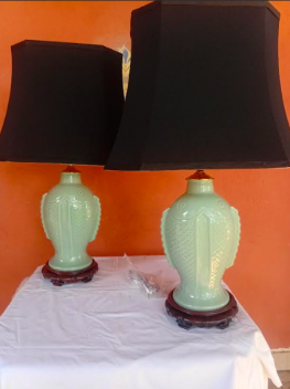 Chinoiserie Vintage Celadon 1970s – Par Raro com Bases de Rosewood e Cúpulas Sob Medida