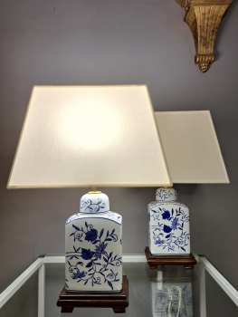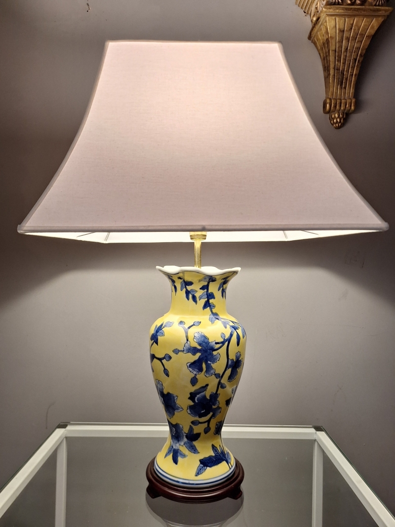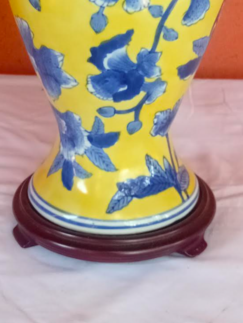 Peça em porcelana pintada à mão, nas cores Amarelo Imperial e Azul, com base original em rosewood.