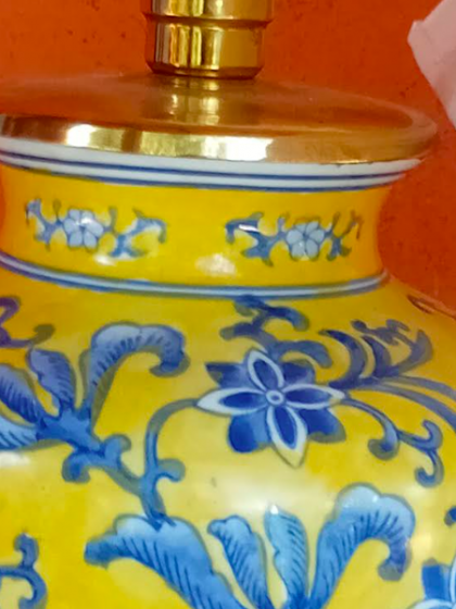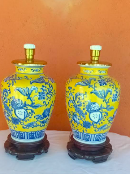 Chinoiserie, raríssimo par, Vintage 1960s, porcelana pintada à mão em Amarelo Imperial e Azul, com base de rosewood.