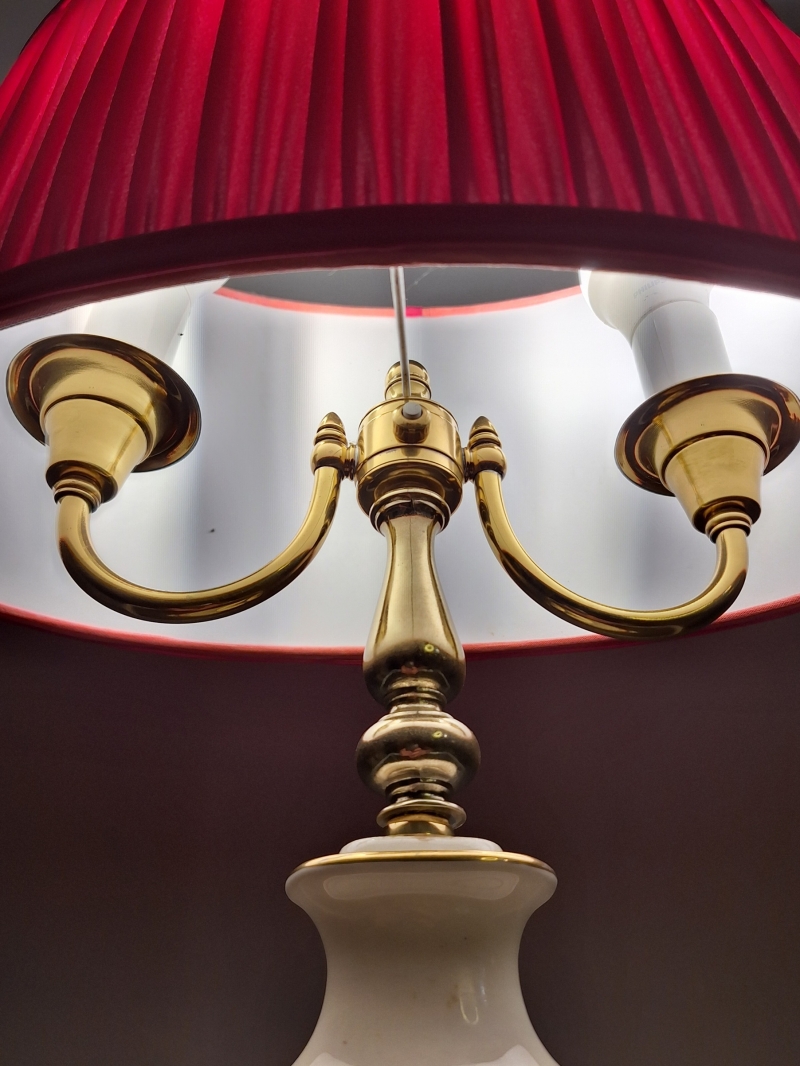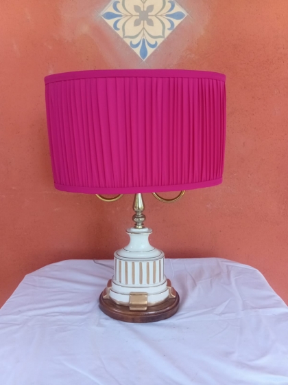 Abajour Francês 1930s/40s; Bouillotte porcelana com acentos dourados, base madeira.