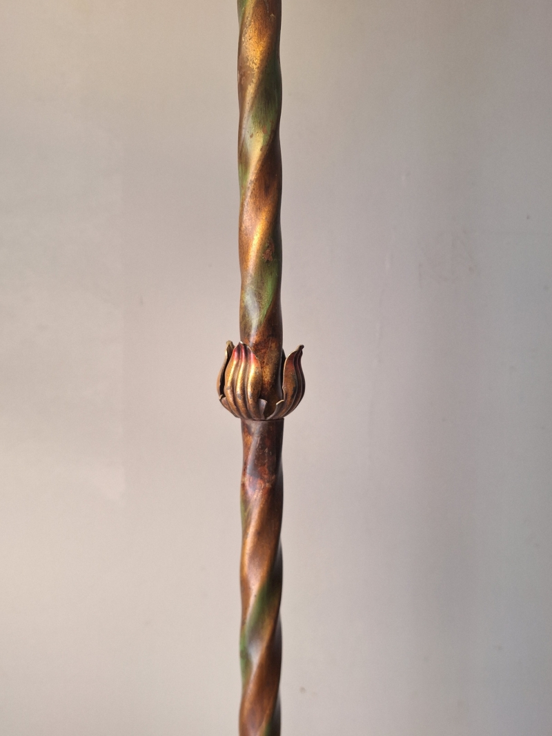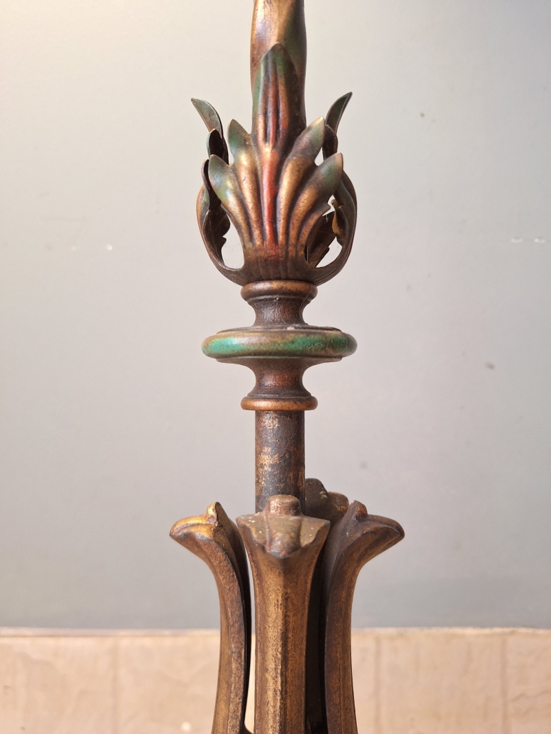 Antique Art Nouveau Cast Iron Floor Lamp (1918), com lindos detalhes em verde, vermelho, e dourado.