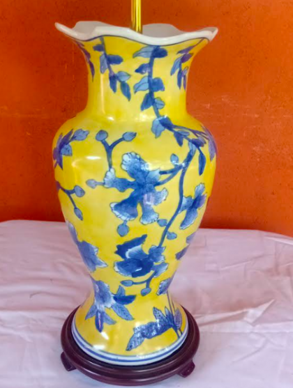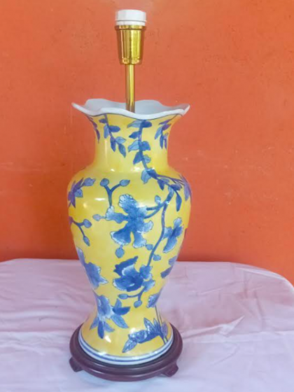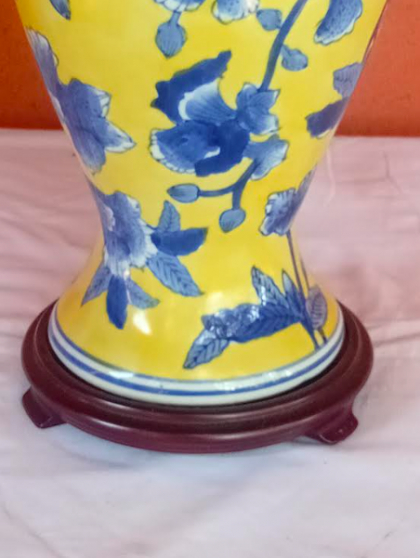 Peça em porcelana pintada à mão, nas cores Amarelo Imperial e Azul, com base original em rosewood.