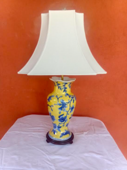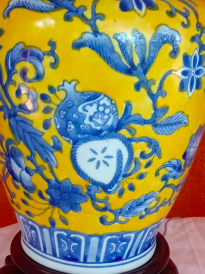 Chinoiserie, raríssimo par, Vintage 1960s, porcelana pintada à mão em Amarelo Imperial e Azul, com base de rosewood.