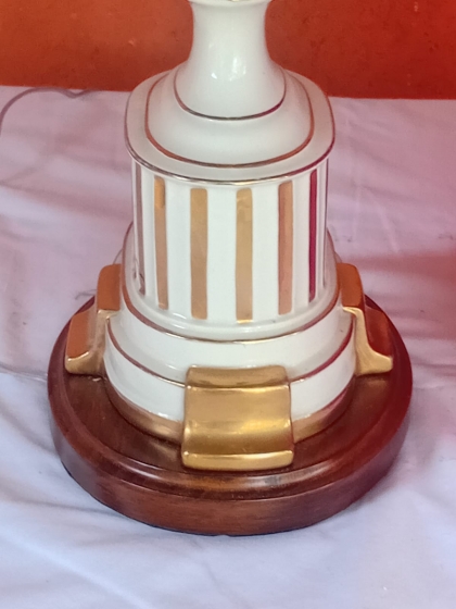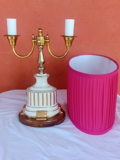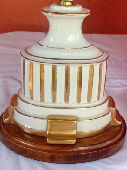 Abajour Francês 1930s/40s; Bouillotte porcelana com acentos dourados, base madeira.