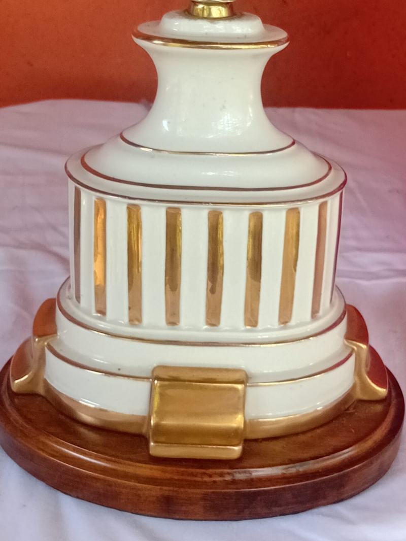 Abajour Francês Bouillotte 1930s/40s em Porcelana com Acentos Dourados e Base em Madeira